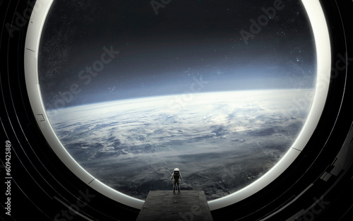 Wall mural astronaut at a huge window of spaceship observes the orbit of the planet earth. 5k realistic science - Wall murals Wall mural astronaut at a huge window of spaceship observes the orbit of the planet earth. 5k realistic science - Wall murals