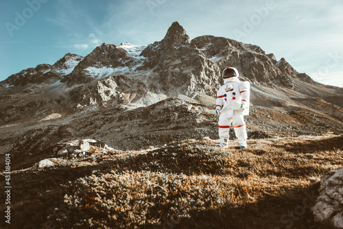 Wall mural astronaut exploring a new planet. searching for a new home for humanity. concept about science and n - Wall murals Wall mural astronaut exploring a new planet. searching for a new home for humanity. concept about science and n - Wall murals