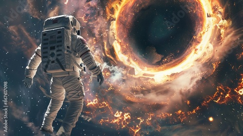 Wall mural : Astronaut exploring cosmic mysteries: space explorer in front of a majestic black hole in the univer