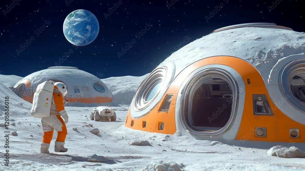 Wall mural : Astronaut exploring lunar habitat with earth visible in the background