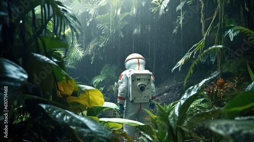 The watermark will not be included on Wall mural.: Astronaut exploring the rainforest generative ai