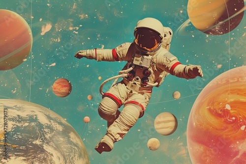 The watermark will not be included on Wall mural.: Astronaut floating on background of galaxy planets - contemporary art collage - generative ai