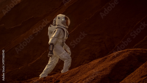 Wall mural astronaut goes up the mountain to explore red planet/ mars. in the background his base and ai powere
