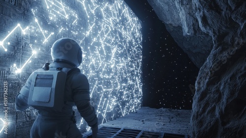 Wall mural : Astronaut in a mysterious cave with glowing star patterns