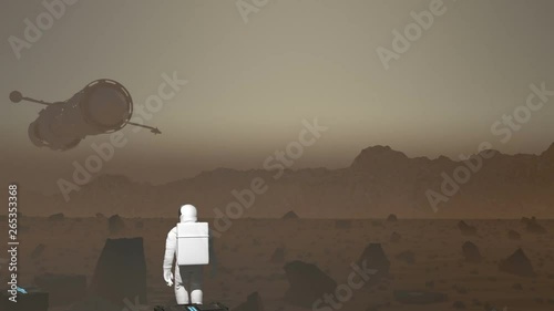 The watermark will not be included on Wall mural.: Astronaut in a space suit walks into the middle of frame on a mars like planet as a large futuristic