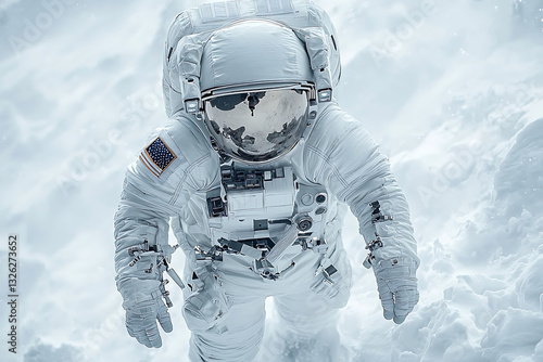 The watermark will not be included on Wall mural.: Astronaut in a white spacesuit stands against a cloudy ethereal backdrop evoking exploration and a s