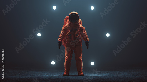 Wall mural astronaut in an orange space suit with black visor standing in a alien void 3d illustration 3d rende - Wall murals Wall mural astronaut in an orange space suit with black visor standing in a alien void 3d illustration 3d rende - Wall murals