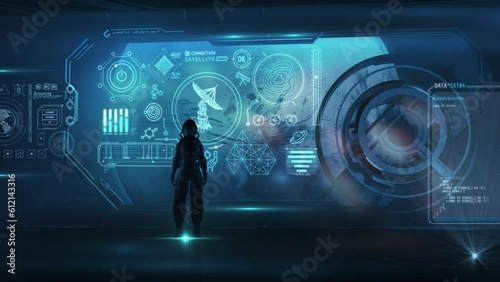 Wall mural astronaut in front of a virtual panel. 3d render