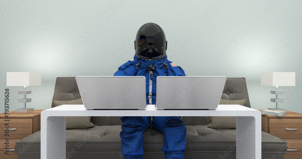 Wall mural astronaut in space suit working with laptop computers. writing code. space and technology related sc - Wall murals Wall mural astronaut in space suit working with laptop computers. writing code. space and technology related sc - Wall murals