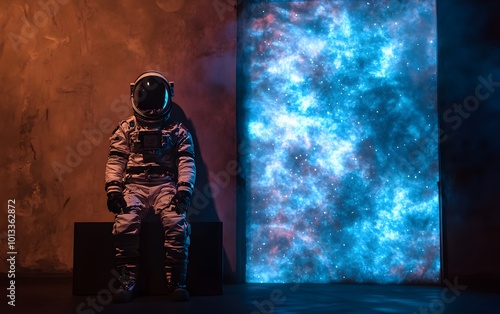 The watermark will not be included on Wall mural.: Astronaut in spacesuit standing in front of cosmic background