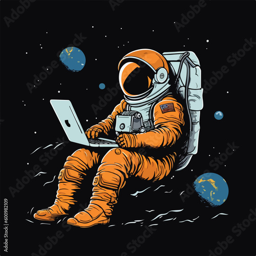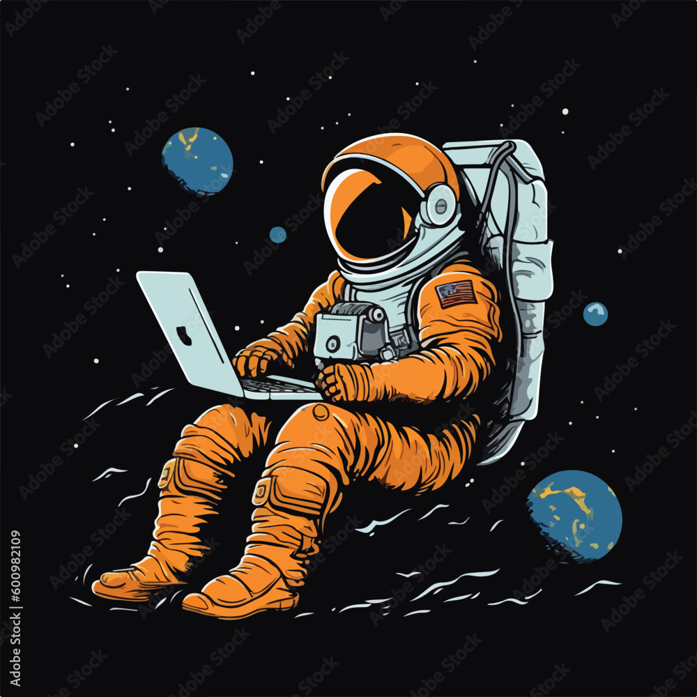 Wall mural : Astronaut in spacesuit working using laptop computer vintage badge logo vector illustration for t sh