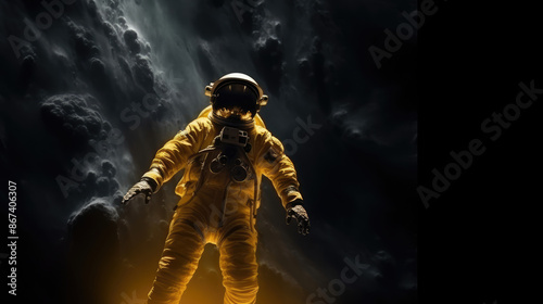 The watermark will not be included on Wall mural.: Astronaut in yellow suit isolated on black - science fiction art - space fantasy image with astronaut