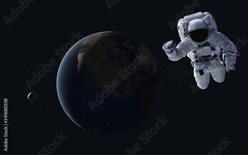 Wall mural astronaut near earth planet and moon of solar system at night. science fiction 3d render. elements o