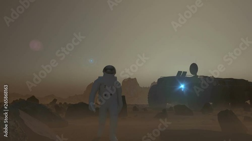 The watermark will not be included on Wall mural.: Astronaut on desolate mars like planet surface, with an all terrain vehicle parked in the background