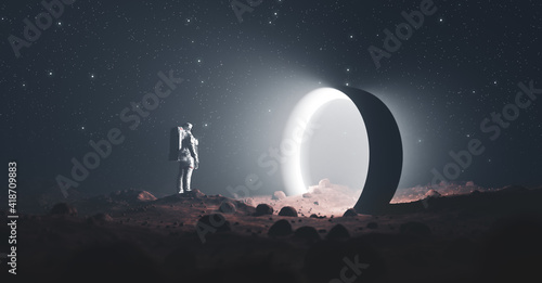 Wall mural astronaut on foreign planet in front of spacetime portal light