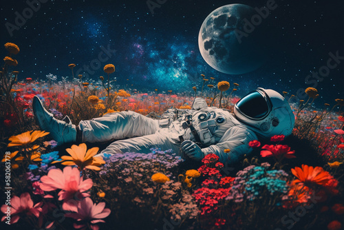 Wall mural : Astronaut or space man relaxing on a planet on a beautiful field of flowers - freedom and creativity