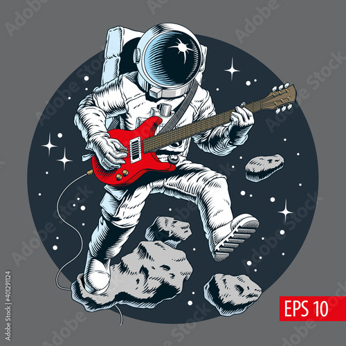 The watermark will not be included on Wall mural.: Astronaut playing electric guitar in space - stars and asteroids on background - vector illustration -