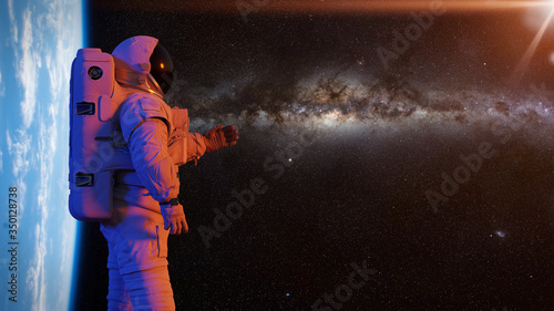 Wall mural astronaut presenting an empty space in front of planet earth and the milky way galaxy
