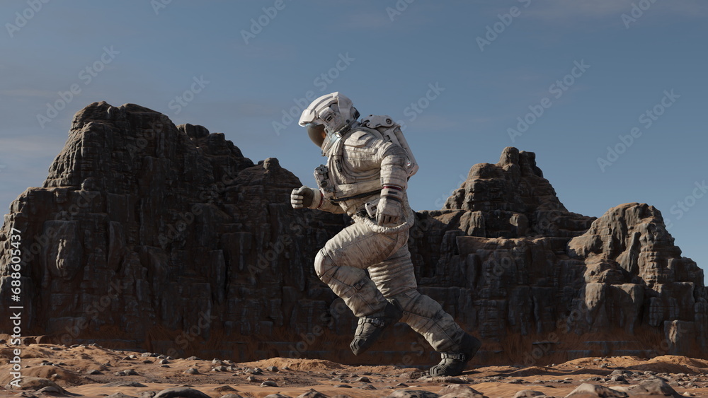 Wall mural astronaut running across planet mars, exploring other planets and worlds. cosmonaut in a white space