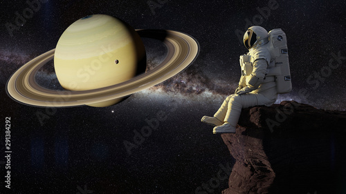 Wall mural astronaut sitting on a cliff on one of the moons of saturn - Wall murals Wall mural astronaut sitting on a cliff on one of the moons of saturn - Wall murals