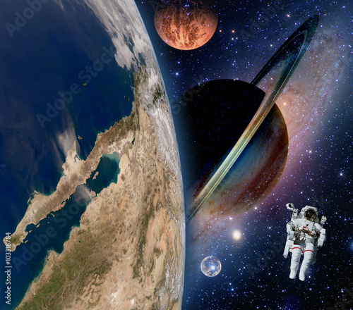Wall mural astronaut spaceman mars saturn planet spacewalk earth outer space walk galaxy. elements of this imag