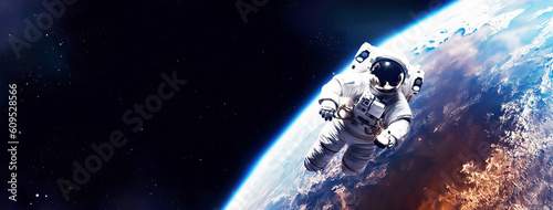 Wall mural astronaut spaceman on space station in outer space with planet earth background. astronauts wear ful