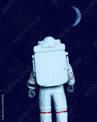 Wall mural astronaut standing and looking at moon and outer space. 3d rendering. - Wall murals Wall mural astronaut standing and looking at moon and outer space. 3d rendering. - Wall murals
