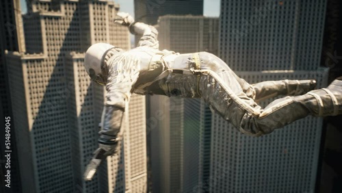Wall mural astronaut traveler flying past skyscrapers. astronaut's fall from space to the planet. the flight of
