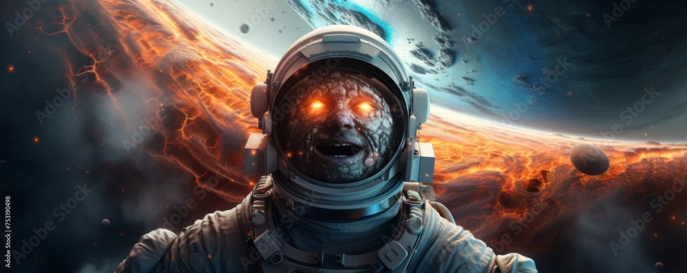 The watermark will not be included on Wall mural.: Astronaut walking in space exploring universe planets and space life, banner - generative ai -