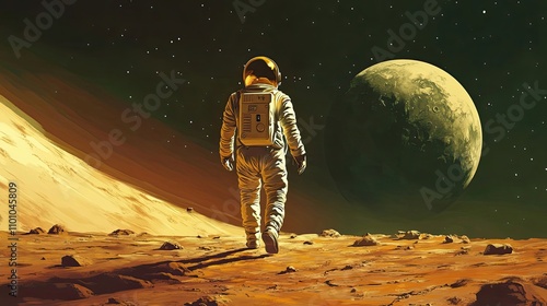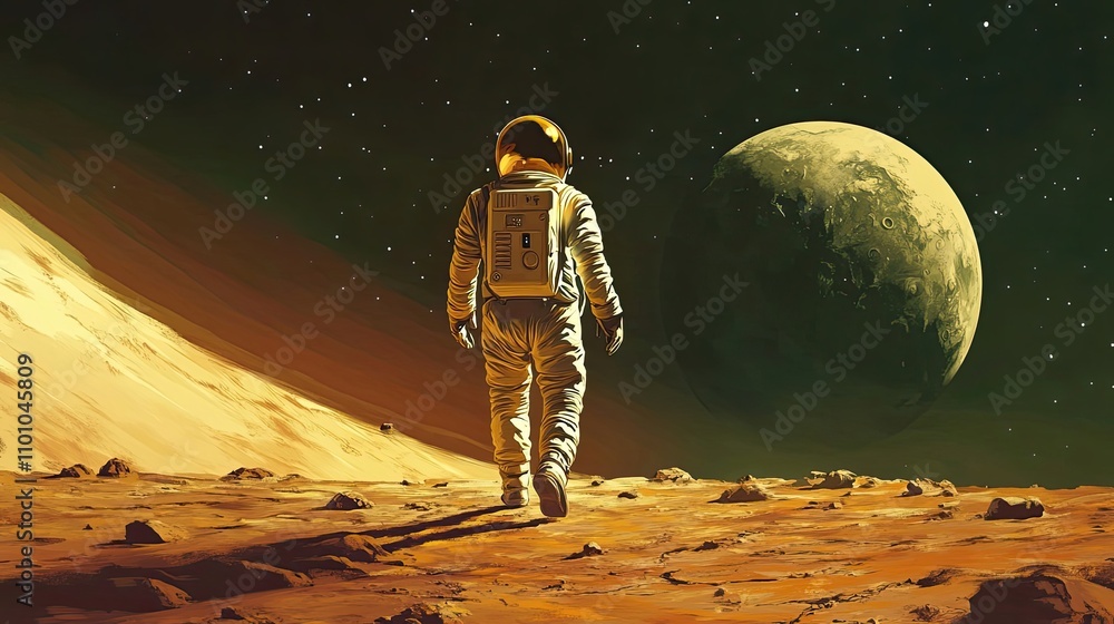 The watermark will not be included on Wall mural.: Astronaut walks on alien planet towards distant orb