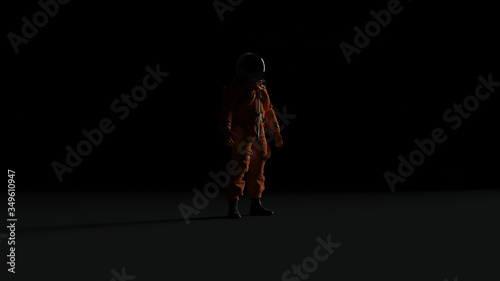 Wall mural : Astronaut with black visor and orange spacesuit back light with dark grey background with back side