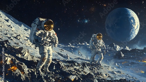 Wall mural astronauts exploring an asteroid 3d rendering. - Wall murals Wall mural astronauts exploring an asteroid 3d rendering. - Wall murals