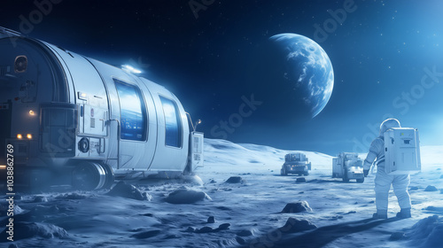 Wall mural : Astronauts exploring the lunar surface with a habitat module and earth visible in the background