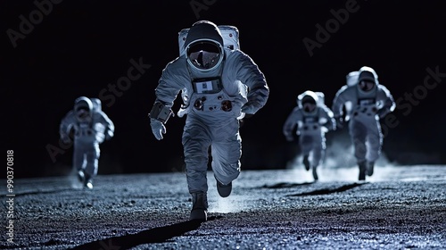 The watermark will not be included on Wall mural.: Astronauts running on a dark, lunar surface