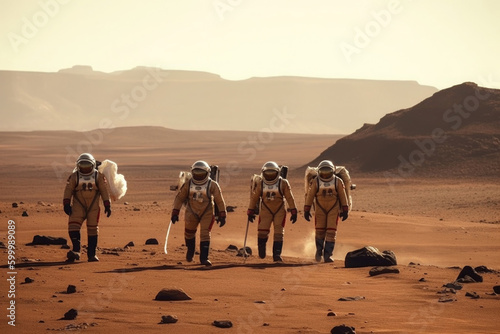 Wall mural astronauts wearing space suits walking on red planet. martian colony. mars colonization. created wit - Wall murals Wall mural astronauts wearing space suits walking on red planet. martian colony. mars colonization. created wit - Wall murals