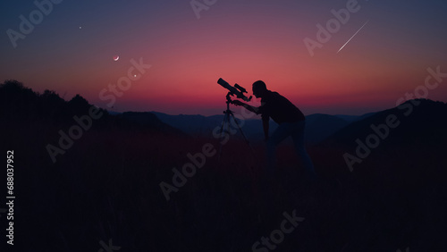 Wall mural : Astronomer looking at the stars, planets, moon and celestial objects with a telescope -