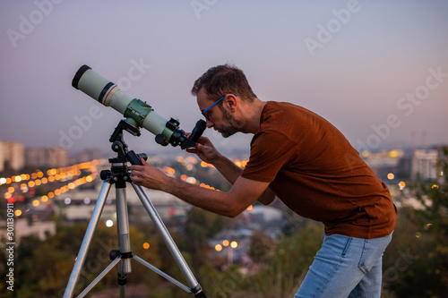 Wall mural : Astronomer with a telescope watching at the stars and moon with blurred city lights in the backgroun