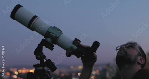 Wall mural astronomer with a telescope watching at the stars and moon with blurred city lights in the backgroun
