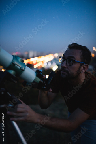 Wall mural : Astronomer with a telescope watching at the stars and moon with blurred city lights in the backgroun
