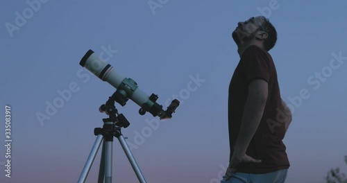 The watermark will not be included on Wall mural.: Astronomer with a telescope watching at the stars and moon with blurred city lights in the backgroun