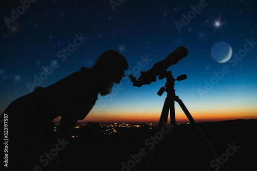 Wall mural astronomer with a telescope watching at the stars and moon with blurred city lights in the backgroun
