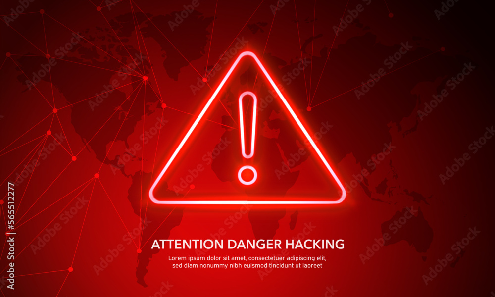 Wall mural attention danger hacking. neon symbol on red map technology connection background. security protecti