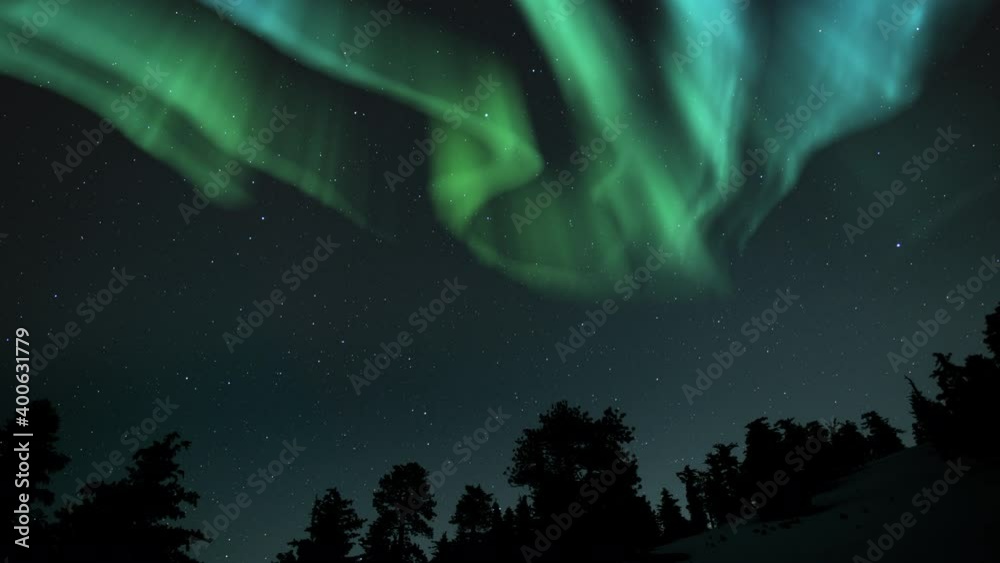 The watermark will not be included on Wall mural.: Aurora green above pine tree forest loop