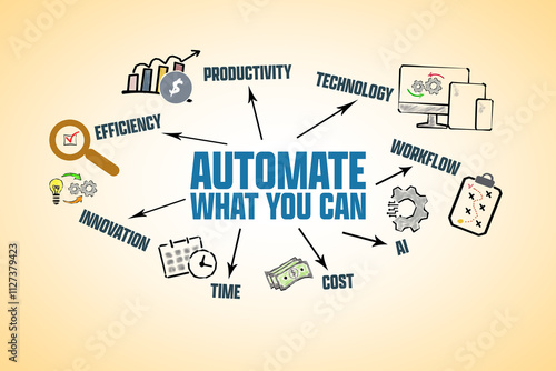 Automate what you can concept - illustration with icons, keywords and arrows on a yellow backgroundWall mural