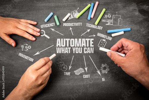 The watermark will not be included on Wall mural.: Automate what you can - illustration with icons, arrows and keywords on a black chalkboard background