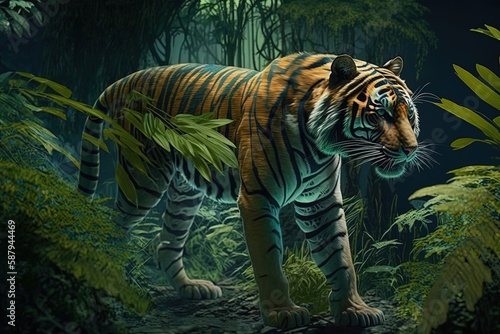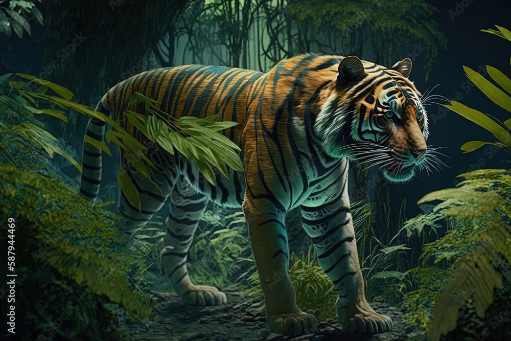 Wall mural automated tiger roaming through a virtual jungle generative ai