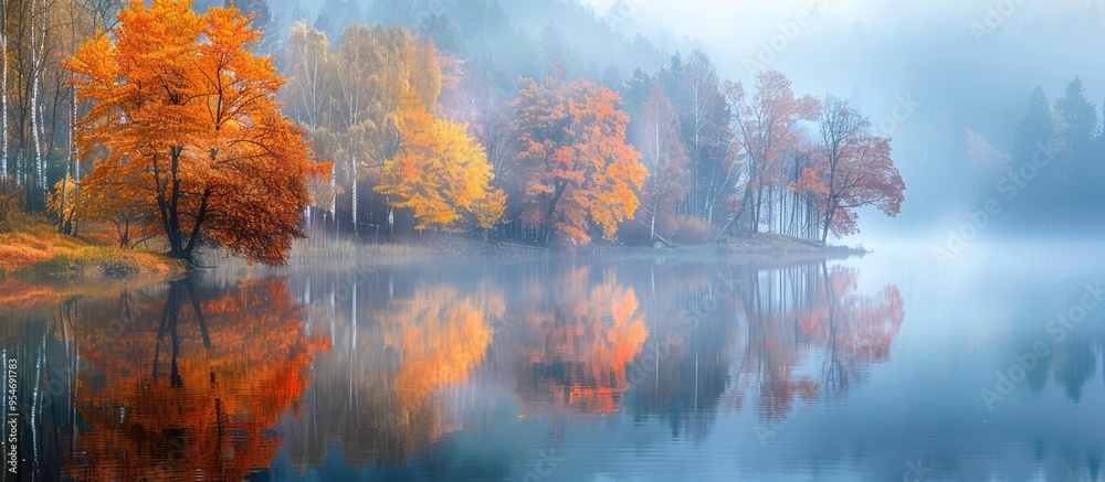Wall mural autumn colored foggy lake. with copy space image. place for adding text or design - Wall murals Wall mural autumn colored foggy lake. with copy space image. place for adding text or design - Wall murals