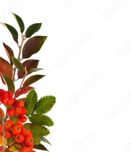 Wall mural autumn colorful leaves and berries of rowan tree in a corner arrangement isolated on white or transp