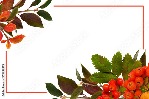 The watermark will not be included on Wall mural.: Autumn colorful leaves and berries of rowan tree in a corner arrangements and a frame isolated on wh