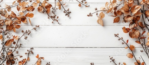 Wall mural autumn dried vegetation on white wood. copy space image. place for adding text and design